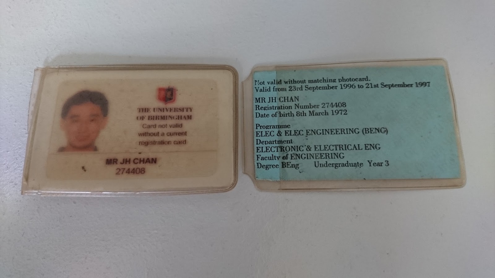 Junt Hoong Chan MIET MIEEE CEng Student ID and Registration Card from September 1995 to September 1997 from the University of Birmingham, Birmingham, England. The Student Photocard is not valid without the Registration Card in the University of Birmingham and is required for the University's Library and School of Electronic, Electrical and Communications Engineering in the University of Birmingham and also required to open banking accounts with major banks like Natwest, Barclays and HSBC in the University of Birmingham, Birmingham, England and with major banking institutions in England as students.